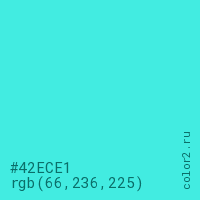 Цвет #42ECE1 в цветовой модели RGB обозначается тремя октетами (66, 236, 225) в десятичном формате и #42ECE1 в шестнадцатиричном (hex) формате, которые являются интенсивностью красного 66 (hex 42), интенсивность зелёного 236 (hex EC) и интенсивность синего 225 (hex E1).