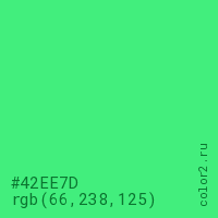 Цвет #42EE7D в цветовой модели RGB обозначается тремя октетами (66, 238, 125) в десятичном формате и #42EE7D в шестнадцатиричном (hex) формате, которые являются интенсивностью красного 66 (hex 42), интенсивность зелёного 238 (hex EE) и интенсивность синего 125 (hex 7D).