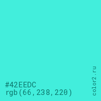 Цвет #42EEDC в цветовой модели RGB обозначается тремя октетами (66, 238, 220) в десятичном формате и #42EEDC в шестнадцатиричном (hex) формате, которые являются интенсивностью красного 66 (hex 42), интенсивность зелёного 238 (hex EE) и интенсивность синего 220 (hex DC).