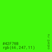 Цвет #42F70B в цветовой модели RGB обозначается тремя октетами (66, 247, 11) в десятичном формате и #42F70B в шестнадцатиричном (hex) формате, которые являются интенсивностью красного 66 (hex 42), интенсивность зелёного 247 (hex F7) и интенсивность синего 11 (hex 0B).