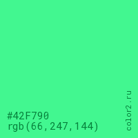 Цвет #42F790 в цветовой модели RGB обозначается тремя октетами (66, 247, 144) в десятичном формате и #42F790 в шестнадцатиричном (hex) формате, которые являются интенсивностью красного 66 (hex 42), интенсивность зелёного 247 (hex F7) и интенсивность синего 144 (hex 90).