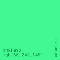 Цвет #42F892 в цветовой модели RGB обозначается тремя октетами (66, 248, 146) в десятичном формате и #42F892 в шестнадцатиричном (hex) формате, которые являются интенсивностью красного 66 (hex 42), интенсивность зелёного 248 (hex F8) и интенсивность синего 146 (hex 92).