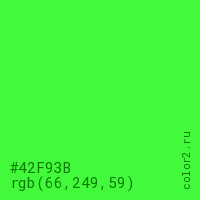 Цвет #42F93B в цветовой модели RGB обозначается тремя октетами (66, 249, 59) в десятичном формате и #42F93B в шестнадцатиричном (hex) формате, которые являются интенсивностью красного 66 (hex 42), интенсивность зелёного 249 (hex F9) и интенсивность синего 59 (hex 3B).