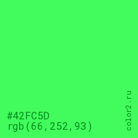 Цвет #42FC5D в цветовой модели RGB обозначается тремя октетами (66, 252, 93) в десятичном формате и #42FC5D в шестнадцатиричном (hex) формате, которые являются интенсивностью красного 66 (hex 42), интенсивность зелёного 252 (hex FC) и интенсивность синего 93 (hex 5D).
