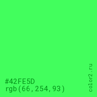 Цвет #42FE5D в цветовой модели RGB обозначается тремя октетами (66, 254, 93) в десятичном формате и #42FE5D в шестнадцатиричном (hex) формате, которые являются интенсивностью красного 66 (hex 42), интенсивность зелёного 254 (hex FE) и интенсивность синего 93 (hex 5D).