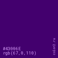 Цвет #43006E в цветовой модели RGB обозначается тремя октетами (67, 0, 110) в десятичном формате и #43006E в шестнадцатиричном (hex) формате, которые являются интенсивностью красного 67 (hex 43), интенсивность зелёного 0 (hex 00) и интенсивность синего 110 (hex 6E).