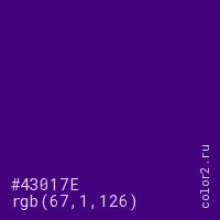 Цвет #43017E в цветовой модели RGB обозначается тремя октетами (67, 1, 126) в десятичном формате и #43017E в шестнадцатиричном (hex) формате, которые являются интенсивностью красного 67 (hex 43), интенсивность зелёного 1 (hex 01) и интенсивность синего 126 (hex 7E).