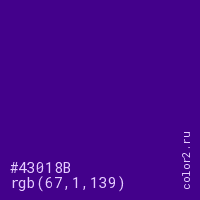 Цвет #43018B в цветовой модели RGB обозначается тремя октетами (67, 1, 139) в десятичном формате и #43018B в шестнадцатиричном (hex) формате, которые являются интенсивностью красного 67 (hex 43), интенсивность зелёного 1 (hex 01) и интенсивность синего 139 (hex 8B).