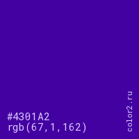 Цвет #4301A2 в цветовой модели RGB обозначается тремя октетами (67, 1, 162) в десятичном формате и #4301A2 в шестнадцатиричном (hex) формате, которые являются интенсивностью красного 67 (hex 43), интенсивность зелёного 1 (hex 01) и интенсивность синего 162 (hex A2).