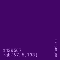 Цвет #430567 в цветовой модели RGB обозначается тремя октетами (67, 5, 103) в десятичном формате и #430567 в шестнадцатиричном (hex) формате, которые являются интенсивностью красного 67 (hex 43), интенсивность зелёного 5 (hex 05) и интенсивность синего 103 (hex 67).