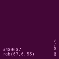 Цвет #430637 в цветовой модели RGB обозначается тремя октетами (67, 6, 55) в десятичном формате и #430637 в шестнадцатиричном (hex) формате, которые являются интенсивностью красного 67 (hex 43), интенсивность зелёного 6 (hex 06) и интенсивность синего 55 (hex 37).