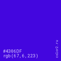Цвет #4306DF в цветовой модели RGB обозначается тремя октетами (67, 6, 223) в десятичном формате и #4306DF в шестнадцатиричном (hex) формате, которые являются интенсивностью красного 67 (hex 43), интенсивность зелёного 6 (hex 06) и интенсивность синего 223 (hex DF).