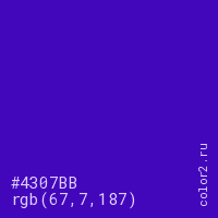 Цвет #4307BB в цветовой модели RGB обозначается тремя октетами (67, 7, 187) в десятичном формате и #4307BB в шестнадцатиричном (hex) формате, которые являются интенсивностью красного 67 (hex 43), интенсивность зелёного 7 (hex 07) и интенсивность синего 187 (hex BB).