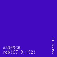 Цвет #4309C0 в цветовой модели RGB обозначается тремя октетами (67, 9, 192) в десятичном формате и #4309C0 в шестнадцатиричном (hex) формате, которые являются интенсивностью красного 67 (hex 43), интенсивность зелёного 9 (hex 09) и интенсивность синего 192 (hex C0).