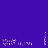 Цвет #430BAF в цветовой модели RGB обозначается тремя октетами (67, 11, 175) в десятичном формате и #430BAF в шестнадцатиричном (hex) формате, которые являются интенсивностью красного 67 (hex 43), интенсивность зелёного 11 (hex 0B) и интенсивность синего 175 (hex AF).