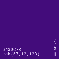 Цвет #430C7B в цветовой модели RGB обозначается тремя октетами (67, 12, 123) в десятичном формате и #430C7B в шестнадцатиричном (hex) формате, которые являются интенсивностью красного 67 (hex 43), интенсивность зелёного 12 (hex 0C) и интенсивность синего 123 (hex 7B).