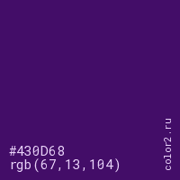 Цвет #430D68 в цветовой модели RGB обозначается тремя октетами (67, 13, 104) в десятичном формате и #430D68 в шестнадцатиричном (hex) формате, которые являются интенсивностью красного 67 (hex 43), интенсивность зелёного 13 (hex 0D) и интенсивность синего 104 (hex 68).