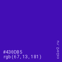 Цвет #430DB5 в цветовой модели RGB обозначается тремя октетами (67, 13, 181) в десятичном формате и #430DB5 в шестнадцатиричном (hex) формате, которые являются интенсивностью красного 67 (hex 43), интенсивность зелёного 13 (hex 0D) и интенсивность синего 181 (hex B5).