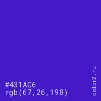 Цвет #431AC6 в цветовой модели RGB обозначается тремя октетами (67, 26, 198) в десятичном формате и #431AC6 в шестнадцатиричном (hex) формате, которые являются интенсивностью красного 67 (hex 43), интенсивность зелёного 26 (hex 1A) и интенсивность синего 198 (hex C6).