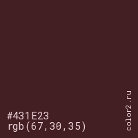 Цвет #431E23 в цветовой модели RGB обозначается тремя октетами (67, 30, 35) в десятичном формате и #431E23 в шестнадцатиричном (hex) формате, которые являются интенсивностью красного 67 (hex 43), интенсивность зелёного 30 (hex 1E) и интенсивность синего 35 (hex 23).