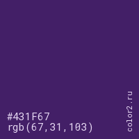 Цвет #431F67 в цветовой модели RGB обозначается тремя октетами (67, 31, 103) в десятичном формате и #431F67 в шестнадцатиричном (hex) формате, которые являются интенсивностью красного 67 (hex 43), интенсивность зелёного 31 (hex 1F) и интенсивность синего 103 (hex 67).