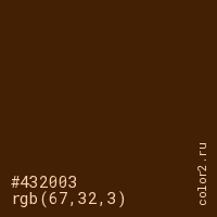 Цвет #432003 в цветовой модели RGB обозначается тремя октетами (67, 32, 3) в десятичном формате и #432003 в шестнадцатиричном (hex) формате, которые являются интенсивностью красного 67 (hex 43), интенсивность зелёного 32 (hex 20) и интенсивность синего 3 (hex 03).