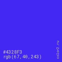 Цвет #4328F3 в цветовой модели RGB обозначается тремя октетами (67, 40, 243) в десятичном формате и #4328F3 в шестнадцатиричном (hex) формате, которые являются интенсивностью красного 67 (hex 43), интенсивность зелёного 40 (hex 28) и интенсивность синего 243 (hex F3).