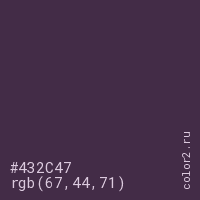 Цвет #432C47 в цветовой модели RGB обозначается тремя октетами (67, 44, 71) в десятичном формате и #432C47 в шестнадцатиричном (hex) формате, которые являются интенсивностью красного 67 (hex 43), интенсивность зелёного 44 (hex 2C) и интенсивность синего 71 (hex 47).