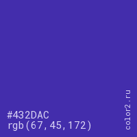 Цвет #432DAC в цветовой модели RGB обозначается тремя октетами (67, 45, 172) в десятичном формате и #432DAC в шестнадцатиричном (hex) формате, которые являются интенсивностью красного 67 (hex 43), интенсивность зелёного 45 (hex 2D) и интенсивность синего 172 (hex AC).