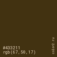 Цвет #433211 в цветовой модели RGB обозначается тремя октетами (67, 50, 17) в десятичном формате и #433211 в шестнадцатиричном (hex) формате, которые являются интенсивностью красного 67 (hex 43), интенсивность зелёного 50 (hex 32) и интенсивность синего 17 (hex 11).