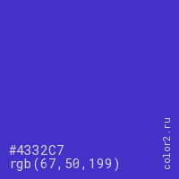 Цвет #4332C7 в цветовой модели RGB обозначается тремя октетами (67, 50, 199) в десятичном формате и #4332C7 в шестнадцатиричном (hex) формате, которые являются интенсивностью красного 67 (hex 43), интенсивность зелёного 50 (hex 32) и интенсивность синего 199 (hex C7).