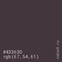 Цвет #43363D в цветовой модели RGB обозначается тремя октетами (67, 54, 61) в десятичном формате и #43363D в шестнадцатиричном (hex) формате, которые являются интенсивностью красного 67 (hex 43), интенсивность зелёного 54 (hex 36) и интенсивность синего 61 (hex 3D).