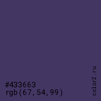 Цвет #433663 в цветовой модели RGB обозначается тремя октетами (67, 54, 99) в десятичном формате и #433663 в шестнадцатиричном (hex) формате, которые являются интенсивностью красного 67 (hex 43), интенсивность зелёного 54 (hex 36) и интенсивность синего 99 (hex 63).