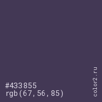 Цвет #433855 в цветовой модели RGB обозначается тремя октетами (67, 56, 85) в десятичном формате и #433855 в шестнадцатиричном (hex) формате, которые являются интенсивностью красного 67 (hex 43), интенсивность зелёного 56 (hex 38) и интенсивность синего 85 (hex 55).
