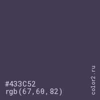 Цвет #433C52 в цветовой модели RGB обозначается тремя октетами (67, 60, 82) в десятичном формате и #433C52 в шестнадцатиричном (hex) формате, которые являются интенсивностью красного 67 (hex 43), интенсивность зелёного 60 (hex 3C) и интенсивность синего 82 (hex 52).