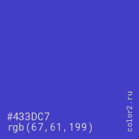 Цвет #433DC7 в цветовой модели RGB обозначается тремя октетами (67, 61, 199) в десятичном формате и #433DC7 в шестнадцатиричном (hex) формате, которые являются интенсивностью красного 67 (hex 43), интенсивность зелёного 61 (hex 3D) и интенсивность синего 199 (hex C7).