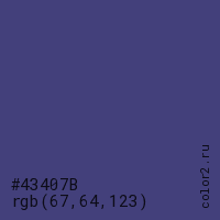 Цвет #43407B в цветовой модели RGB обозначается тремя октетами (67, 64, 123) в десятичном формате и #43407B в шестнадцатиричном (hex) формате, которые являются интенсивностью красного 67 (hex 43), интенсивность зелёного 64 (hex 40) и интенсивность синего 123 (hex 7B).