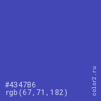 Цвет #4347B6 в цветовой модели RGB обозначается тремя октетами (67, 71, 182) в десятичном формате и #4347B6 в шестнадцатиричном (hex) формате, которые являются интенсивностью красного 67 (hex 43), интенсивность зелёного 71 (hex 47) и интенсивность синего 182 (hex B6).