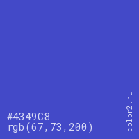 Цвет #4349C8 в цветовой модели RGB обозначается тремя октетами (67, 73, 200) в десятичном формате и #4349C8 в шестнадцатиричном (hex) формате, которые являются интенсивностью красного 67 (hex 43), интенсивность зелёного 73 (hex 49) и интенсивность синего 200 (hex C8).