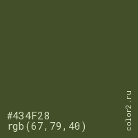 Цвет #434F28 в цветовой модели RGB обозначается тремя октетами (67, 79, 40) в десятичном формате и #434F28 в шестнадцатиричном (hex) формате, которые являются интенсивностью красного 67 (hex 43), интенсивность зелёного 79 (hex 4F) и интенсивность синего 40 (hex 28).