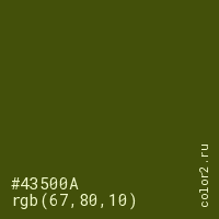 Цвет #43500A в цветовой модели RGB обозначается тремя октетами (67, 80, 10) в десятичном формате и #43500A в шестнадцатиричном (hex) формате, которые являются интенсивностью красного 67 (hex 43), интенсивность зелёного 80 (hex 50) и интенсивность синего 10 (hex 0A).