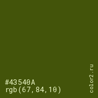 Цвет #43540A в цветовой модели RGB обозначается тремя октетами (67, 84, 10) в десятичном формате и #43540A в шестнадцатиричном (hex) формате, которые являются интенсивностью красного 67 (hex 43), интенсивность зелёного 84 (hex 54) и интенсивность синего 10 (hex 0A).