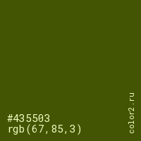 Цвет #435503 в цветовой модели RGB обозначается тремя октетами (67, 85, 3) в десятичном формате и #435503 в шестнадцатиричном (hex) формате, которые являются интенсивностью красного 67 (hex 43), интенсивность зелёного 85 (hex 55) и интенсивность синего 3 (hex 03).