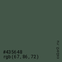 Цвет #435648 в цветовой модели RGB обозначается тремя октетами (67, 86, 72) в десятичном формате и #435648 в шестнадцатиричном (hex) формате, которые являются интенсивностью красного 67 (hex 43), интенсивность зелёного 86 (hex 56) и интенсивность синего 72 (hex 48).