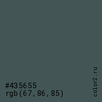 Цвет #435655 в цветовой модели RGB обозначается тремя октетами (67, 86, 85) в десятичном формате и #435655 в шестнадцатиричном (hex) формате, которые являются интенсивностью красного 67 (hex 43), интенсивность зелёного 86 (hex 56) и интенсивность синего 85 (hex 55).