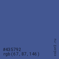 Цвет #435792 в цветовой модели RGB обозначается тремя октетами (67, 87, 146) в десятичном формате и #435792 в шестнадцатиричном (hex) формате, которые являются интенсивностью красного 67 (hex 43), интенсивность зелёного 87 (hex 57) и интенсивность синего 146 (hex 92).