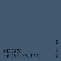 Цвет #435970 в цветовой модели RGB обозначается тремя октетами (67, 89, 112) в десятичном формате и #435970 в шестнадцатиричном (hex) формате, которые являются интенсивностью красного 67 (hex 43), интенсивность зелёного 89 (hex 59) и интенсивность синего 112 (hex 70).