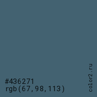 Цвет #436271 в цветовой модели RGB обозначается тремя октетами (67, 98, 113) в десятичном формате и #436271 в шестнадцатиричном (hex) формате, которые являются интенсивностью красного 67 (hex 43), интенсивность зелёного 98 (hex 62) и интенсивность синего 113 (hex 71).