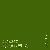 Цвет #436307 в цветовой модели RGB обозначается тремя октетами (67, 99, 7) в десятичном формате и #436307 в шестнадцатиричном (hex) формате, которые являются интенсивностью красного 67 (hex 43), интенсивность зелёного 99 (hex 63) и интенсивность синего 7 (hex 07).