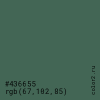 Цвет #436655 в цветовой модели RGB обозначается тремя октетами (67, 102, 85) в десятичном формате и #436655 в шестнадцатиричном (hex) формате, которые являются интенсивностью красного 67 (hex 43), интенсивность зелёного 102 (hex 66) и интенсивность синего 85 (hex 55).